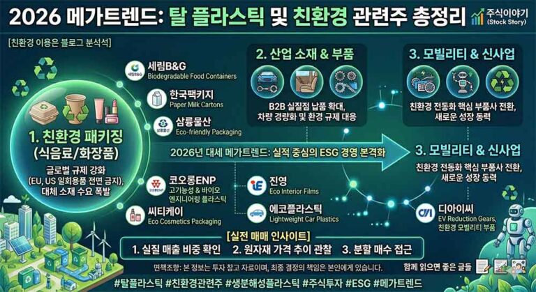 2026년 글로벌 환경 규제가 본격화되며 주목받는 탈 플라스틱, 생분해성, 친환경 패키징 관련주 9종목(세림B&G, 한국팩키지, 코오롱ENP 등)의 핵심 모멘텀과 투자 전략을 분석합니다.