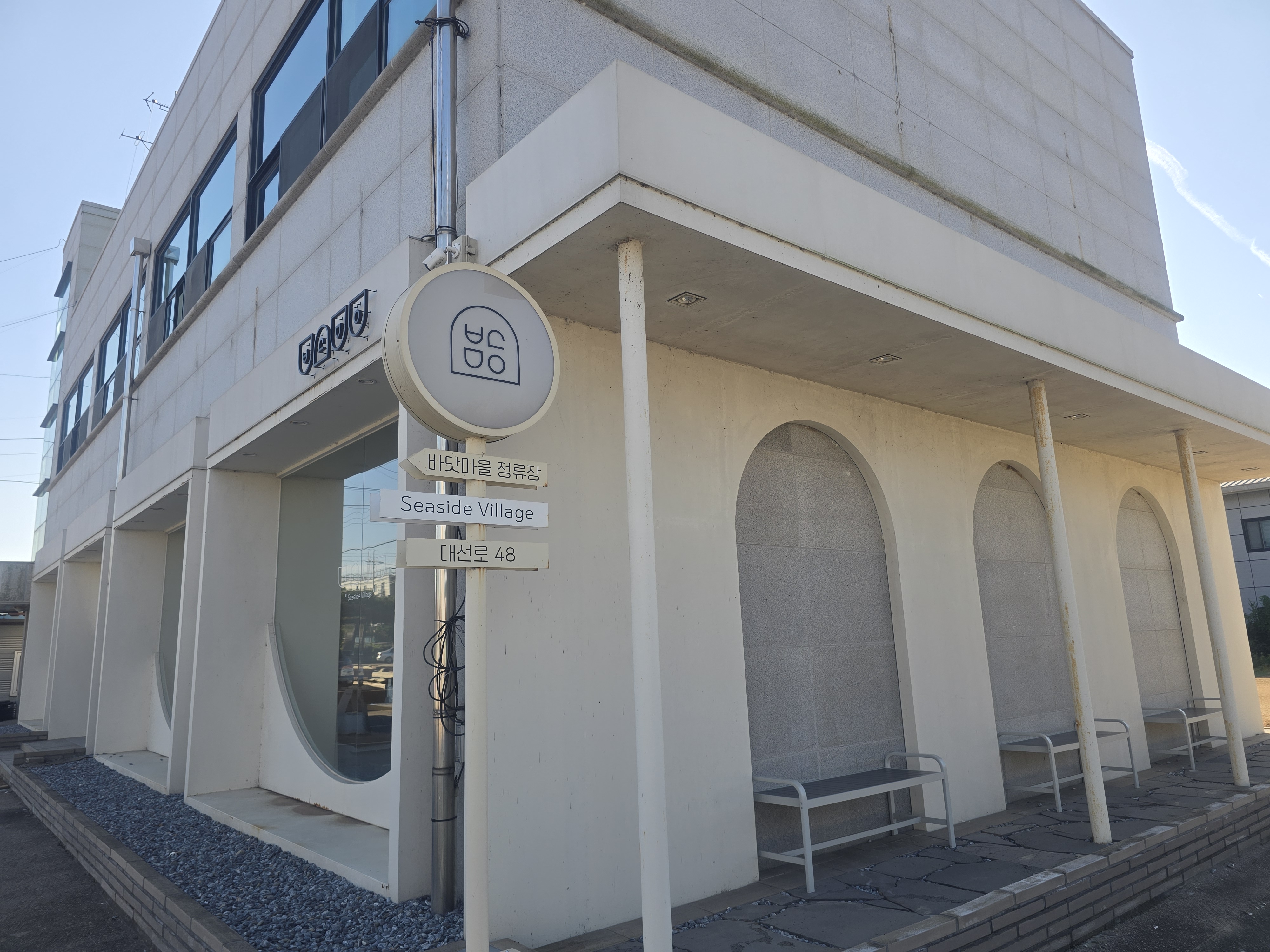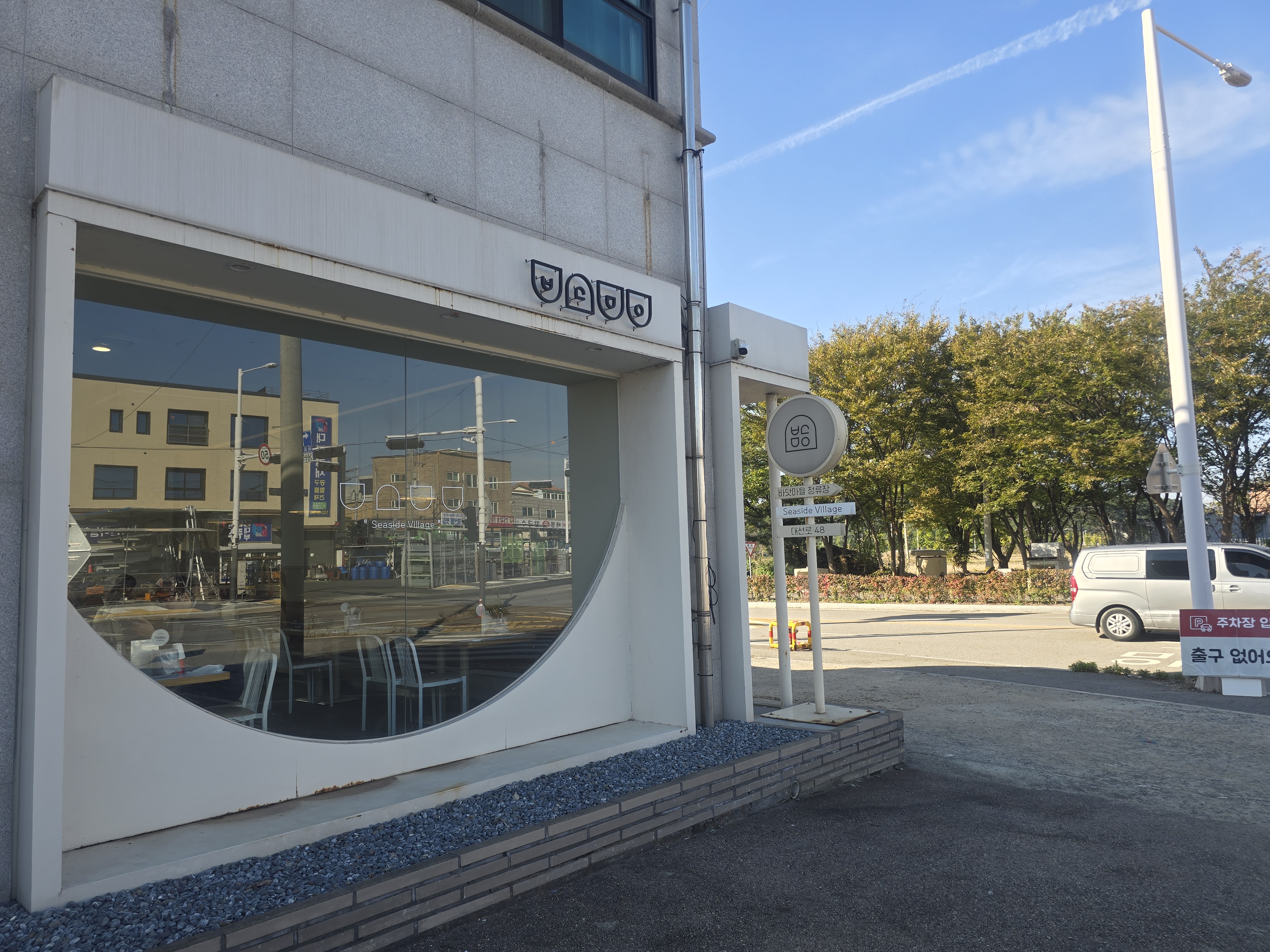 바다를 담은 떡볶이는 건물 전체가 하얀색이고 바로 앞에 주차장만 덩그러니 있어요. 설레이는 마음으로 처음 도착했을 때, 여기가 맞나? 버스 정거장인가? 간판이 어디있지? 하고 당황해서 주변을 몇 번 왔다 갔다 했습니다.