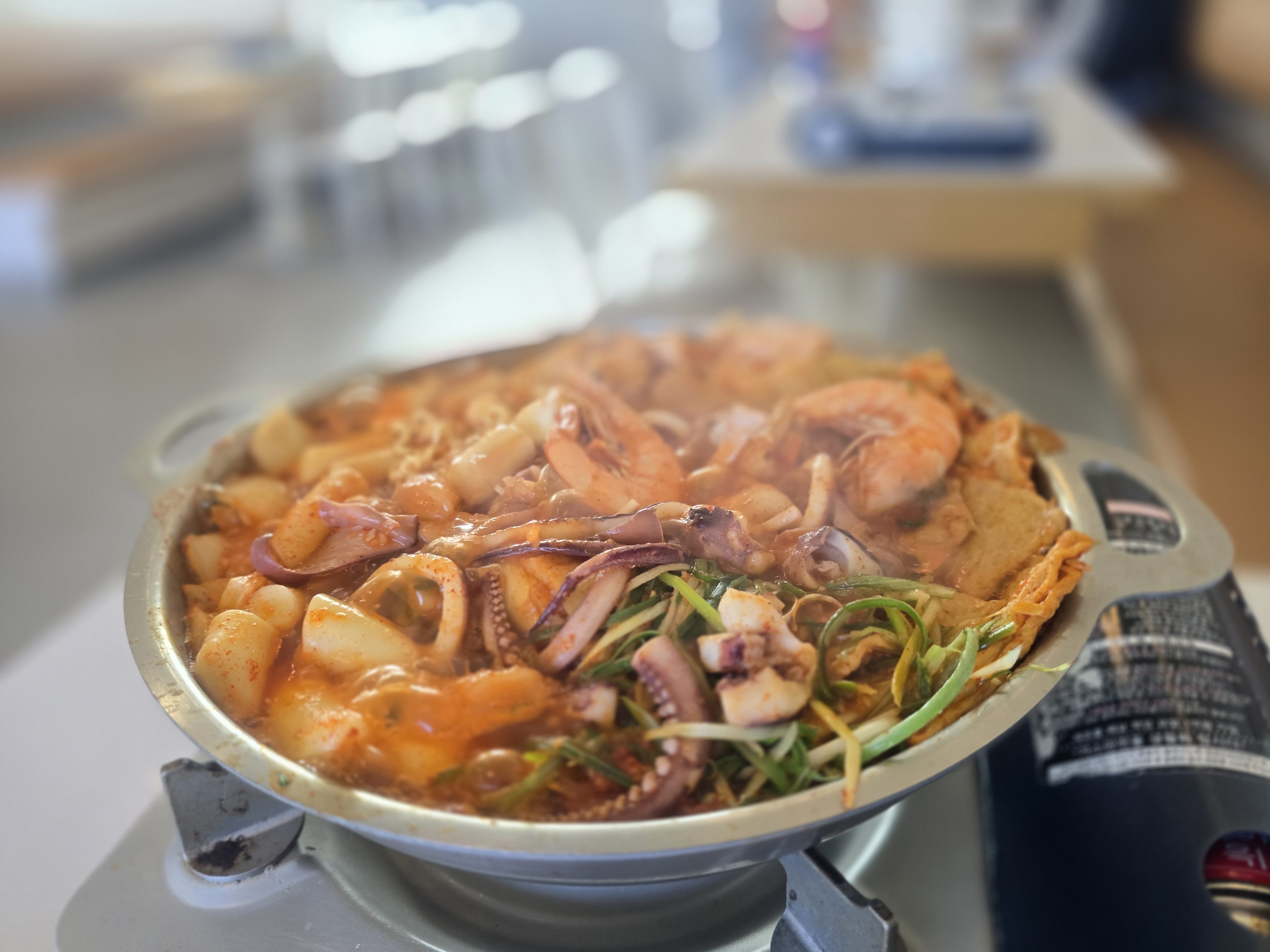 저는 대표 메뉴인 바다 떡볶이를 주문했습니다. 음식이 나오자마자 압도적인 비주얼에 감탄하게 되는데요. 냄비 위를 가득 덮은 통오징어 한 마리와 큼지막한 가리비, 새우가 시선을 사로잡습니다.
